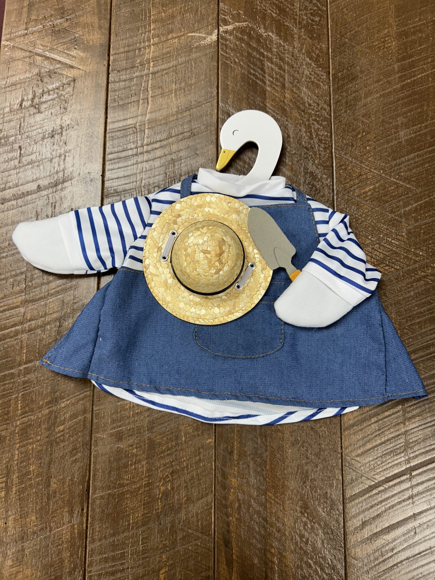 Porch goose garden dress features a straw hat, striped shirt under the jumper dress with a garden trowel in her hand. Get your goose dressed for summer gardening and set her out with your flowers. Metal 21″ goose sold separately. Check out the pinned post on our Facebook page for goose fashion show.